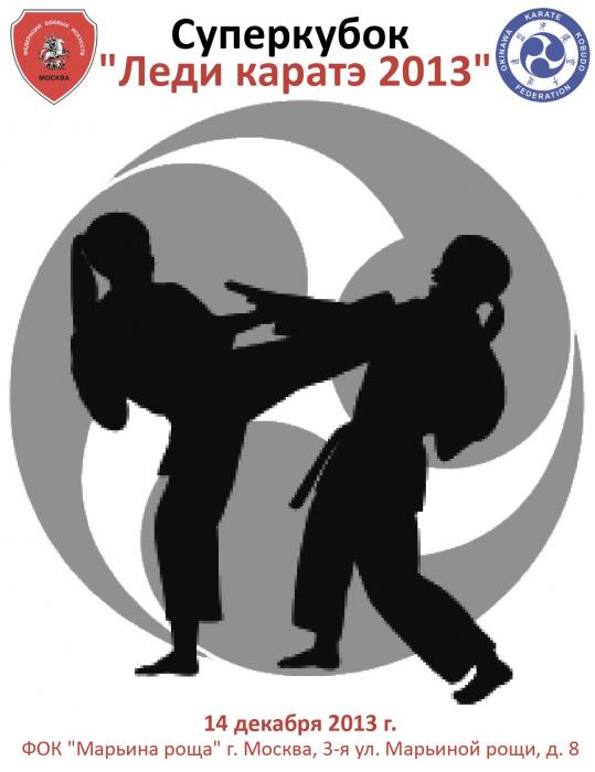 14 декабря 2013г. в хонбу-додзё состоялся Новогодний суперкубок федерации окинава каратэ и кобудо России среди девушек "Леди каратэ 2013". Lady Karate 2013 Open Cup, Bare-fist Full Contact Tournament. Все бои проводились в полный контакт в одной абсолютной весовой категории. Все участницы показали отличную технику и прекрасные бойцовские качества. Победительница турнира Екатерина Горошко получила Суперкубок и денежный приз 30 000 (тридцать тысяч) рублей от ЖСК "Федерация Боевых Искусств". Вице-чемпионы Александра Самойлова (2-ое место) и Ляйсана Бурнашева (3-е место) получили памятные ценные призы и подарочные сертификаты от СПА "Синдо". Также призы зрительских симпатий получили Екатерина Дуденкова и Надежда Крюкова за волю к победе и отличную технику продемонстрированную на турнире. Поздравляем победителей и всех девушек которые приняли участие в соревнованиях.